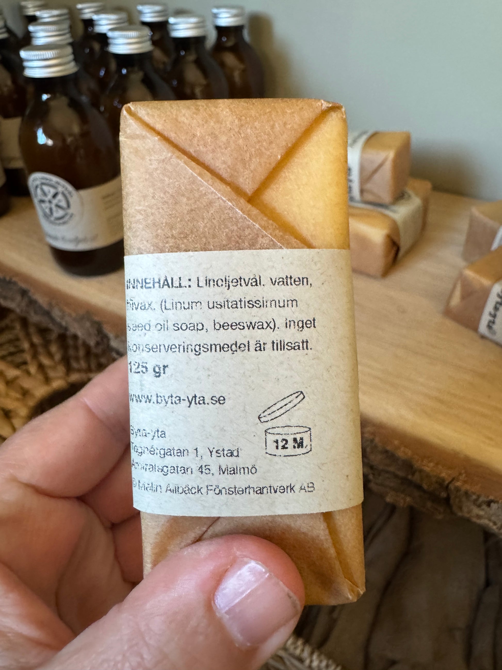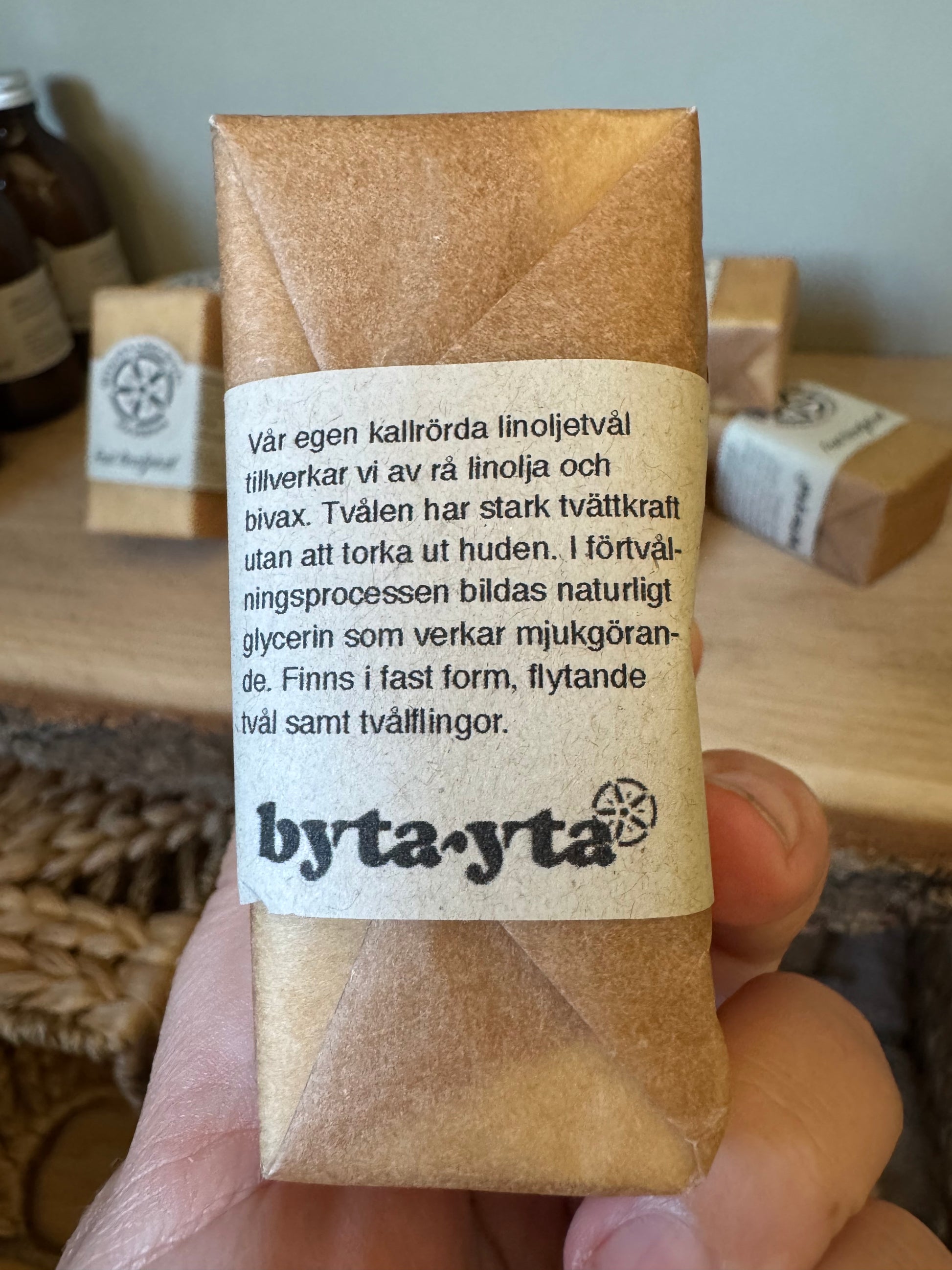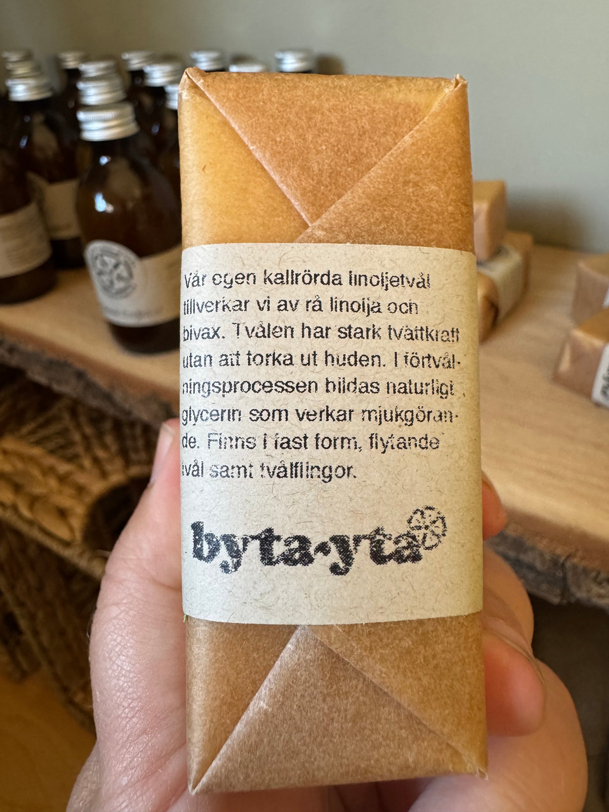 Created by our local producer Byta Yta: We make our own cold-stirred linseed oil soap from raw linseed oil and beeswax. The soap has strong cleaning power without drying out the skin. During the saponification process, natural glycerin is formed, which acts as a softening agent. Available as a solid bar, liquid soap, and soap flakes.